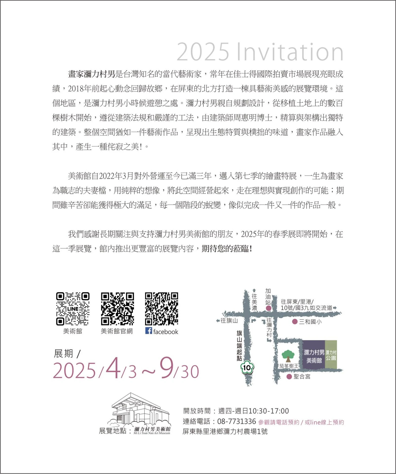 「瀰力村男美術館」是屏東最北邊的美術館,瀰力村男是台灣當代水墨畫家,常年在佳士得國際拍賣會拍出亮眼成績,為展現出在地藝術家的專業涵養,也希望與國際接軌,於是2018年間起心動念回歸故鄉,打造具藝術美感的展覽館-「瀰力村男美術館」,以生活即藝術的概念,推廣生活美學。